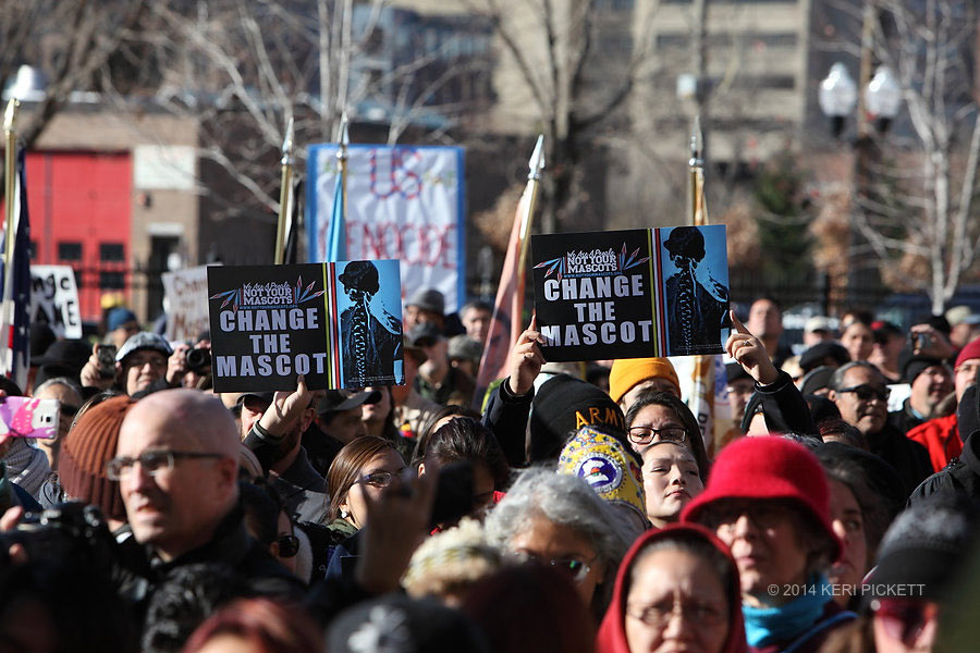 Photography from a rally to #changethename of the Washington Redskins. Native Americans consider the name a slur and the mascot’s depiction cultural appropriation and denigration. A protest was held at the Minnesota Vikings vs Washington Redskin football game at the University of Minnesota stadium.